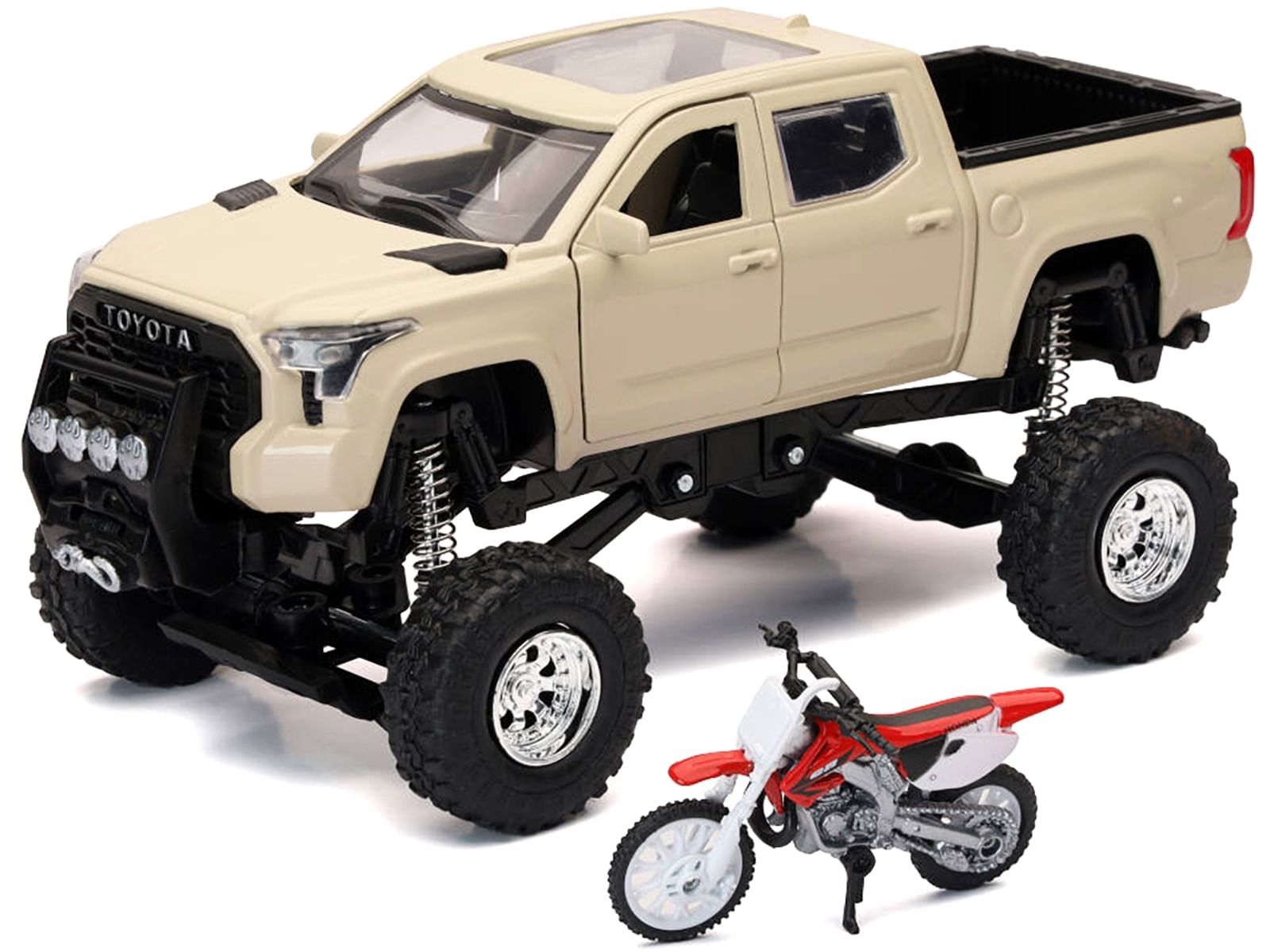 Toyota Tundra Pro Pickup Truck Tan and Honda CR250R Motorcycle Red and White "Xt