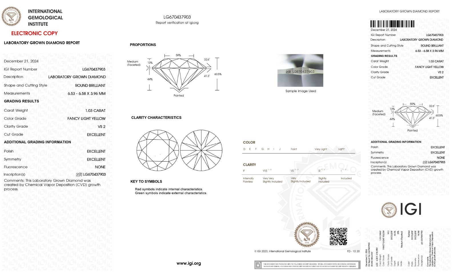Lab Grown Round 1.03 Cts Fancy Light Yellow VS2 IGI Certified CVD Diamond ROUND