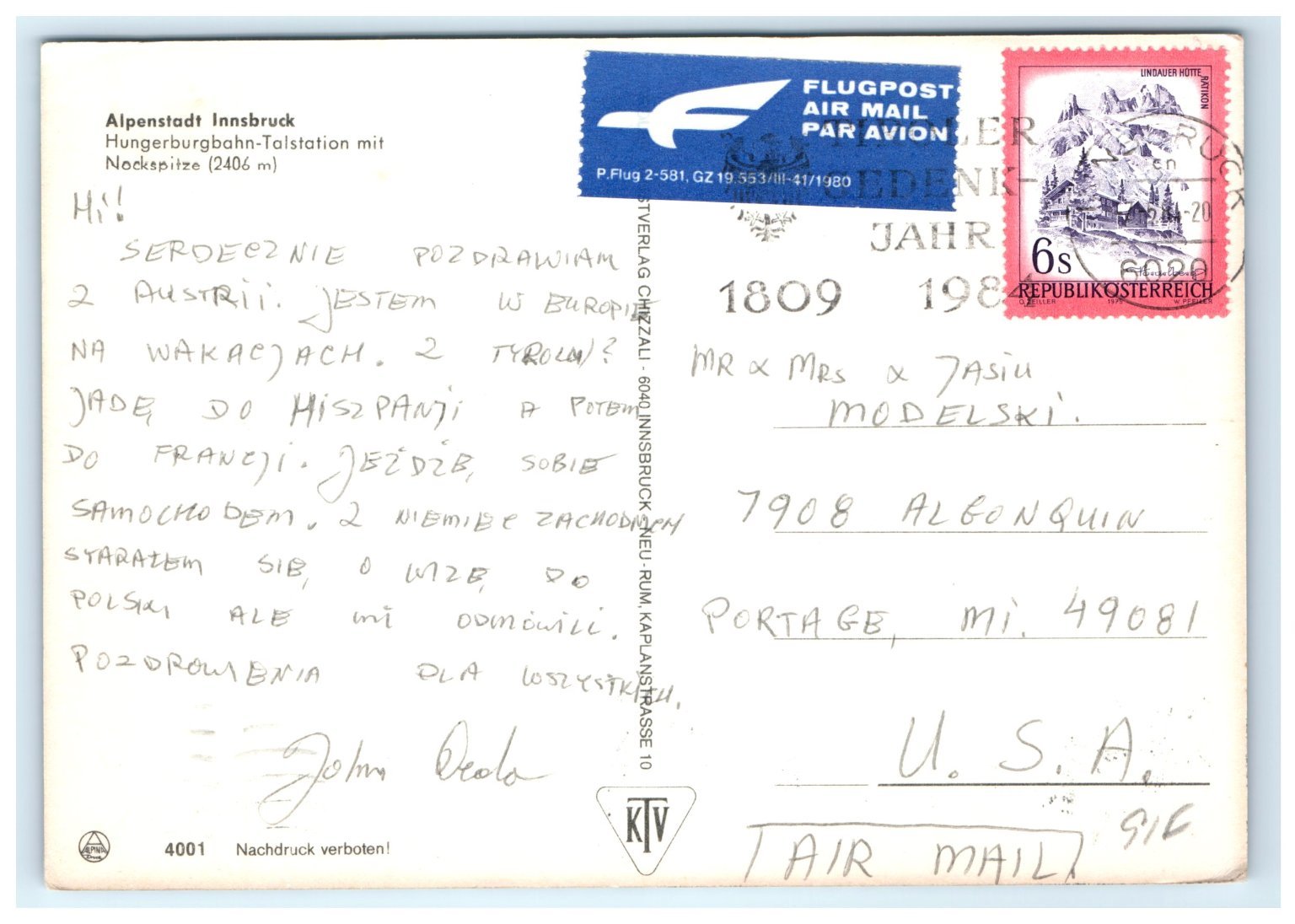The back of the card includes a handwritten message in Polish, an Austrian postage stamp, and an air mail sticker, with a postmark dated 1980. Printed by Verlag Chizzali in Innsbruck, this postcard is a collectible piece for enthusiasts of European travel memorabilia, vintage transportation, and scenic alpine views. Its continental size (6 x 4 inches) makes it ideal for display or framing.