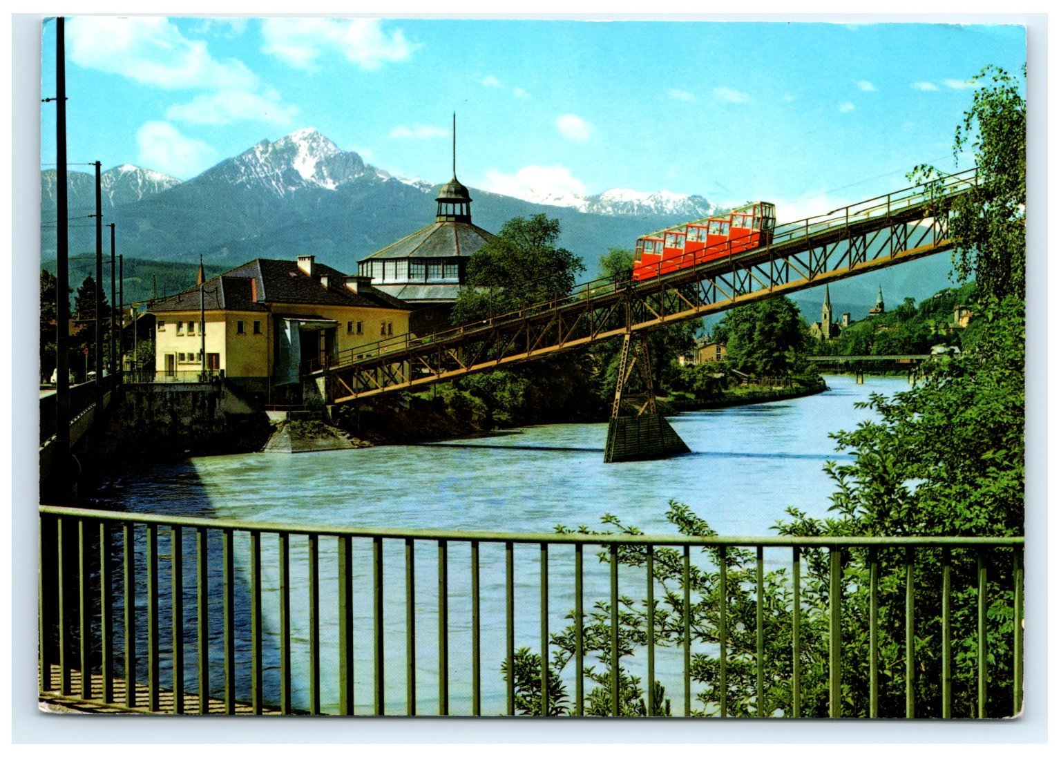 This vibrant vintage postcard captures a stunning view of the Hungerburgbahn funicular railway station in Alpenstadt Innsbruck, Austria, with the majestic Nockspitze mountain (2406 m) in the background. The image features the bright red funicular car ascending the steel track over the flowing river, surrounded by lush greenery and historic buildings. The postcard is a lithograph print on chrome paper, typical of mid-20th century European postcards, offering rich colors and a glossy finish.