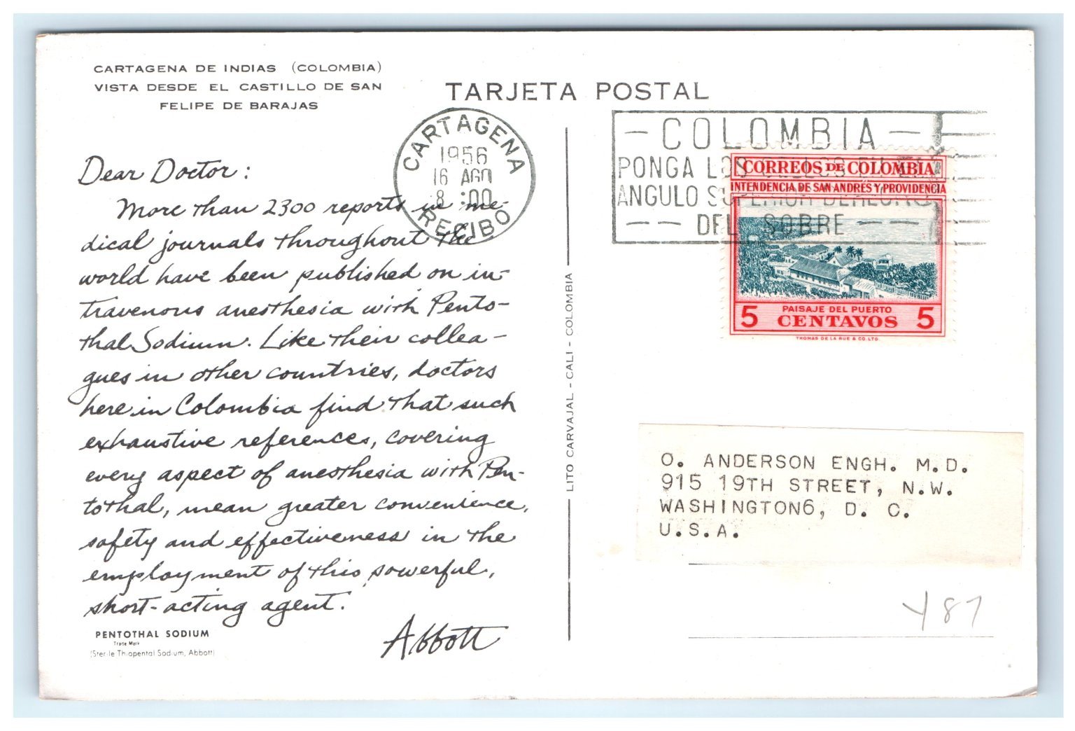Postmarked in 1956, this postcard includes a handwritten message discussing medical advancements, adding a fascinating mid-20th-century historical context. The back features a Colombian postage stamp from the Correos de Colombia series, further enhancing its collectible appeal. A perfect piece for collectors interested in Colombian history, vintage travel memorabilia, or lithographic postcards from Latin America.