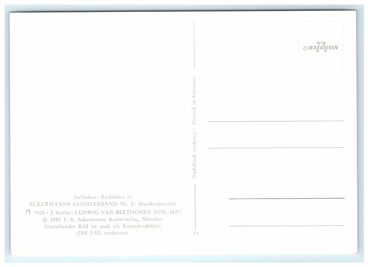 This vintage postcard from 1958 features a detailed lithographic portrait of Ludwig van Beethoven, the renowned German composer and pianist (1770-1827). Produced by F.A. Ackermanns Kunstverlag in Mรผnchen, Germany, this collectible postcard is part of the Ackermanns Sammlerband Nr. 2: Musikerportrats series. The image depicts Beethoven holding a pencil and sheet music, capturing his intense focus and creative spirit.