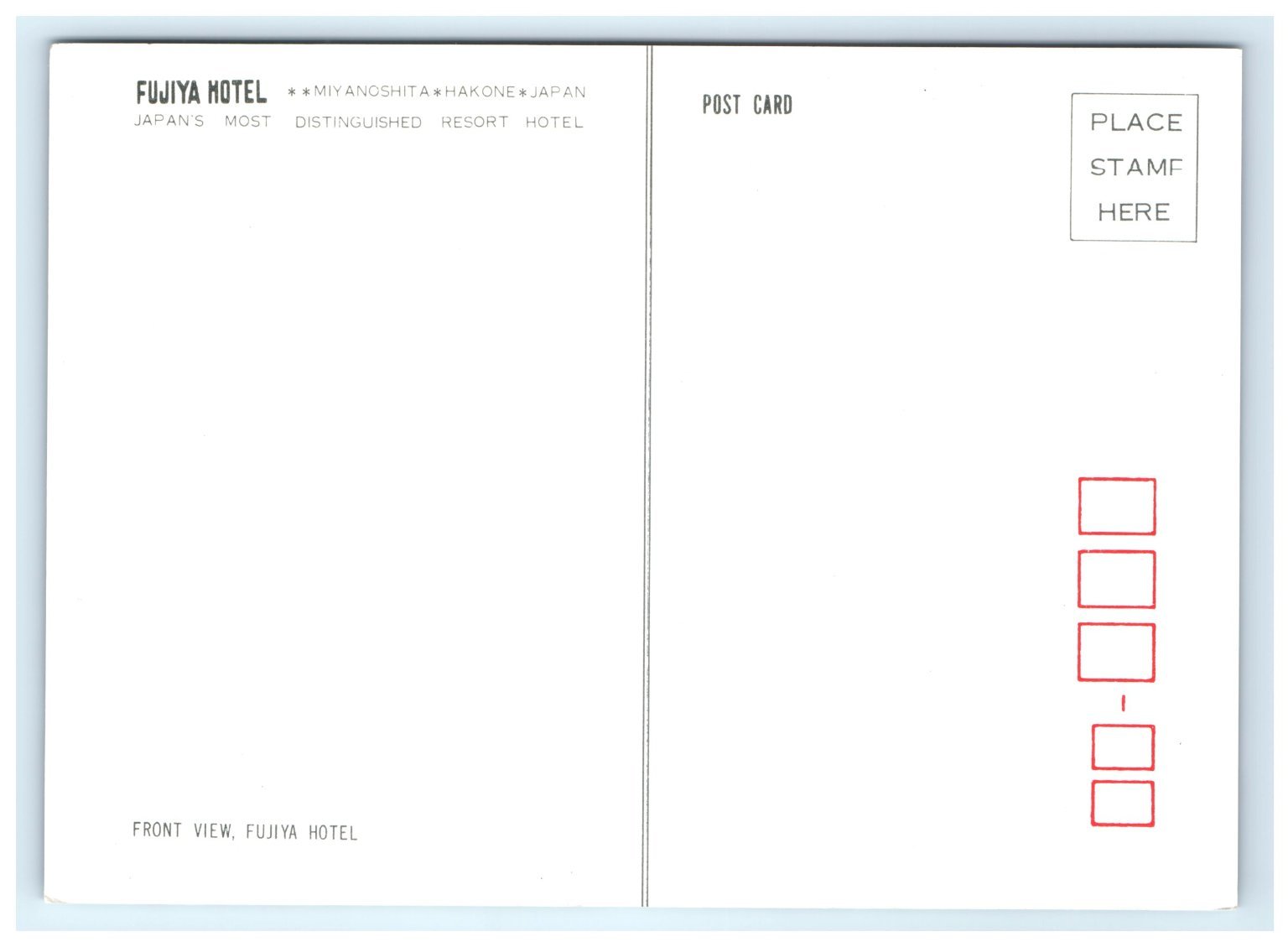 Printed on continental size paper (6 x 4 inches), this original lithograph postcard highlights the intricate design and vibrant color typical of mid-20th century Japanese resort postcards. The back of the card includes clear printed text identifying the Fujiya Hotel in Miyanoshita, Hakone, Japan, along with a designated space for postage, emphasizing its classic postcard format. This postcard is an excellent addition for collectors interested in Japanese landmarks, historic hotels, and vintage travel ephemera.