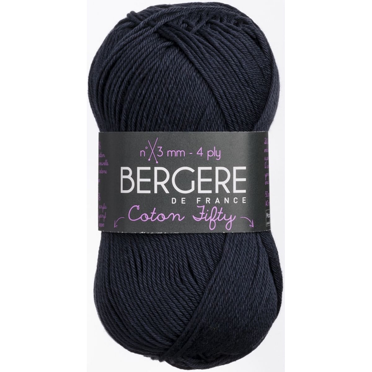 Bergere De France-Coton Fifty Yarn. This fine, but not too fine, round yarn yields an even knit in basic stitches and is easy to care for. Weight category: 2. Content: 50% cotton/50% acrylic. Putup: 1.75ox/50g, 153yd/140m. Gauge: 26sx37r = 4in/10cm on size 3mm knitting needles. Dyelotted: we try but are not always able to match dyelots. Care: machine wash, machine dry, do not bleach, press, dry clean using P solvents. Comes in a variety of colors. Each sold separately. Imported. 1 Pack of 1 Skein
