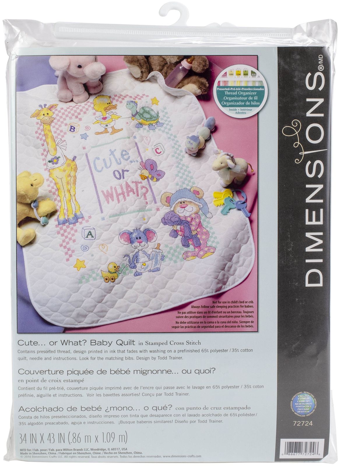 Liven and brighten baby's room with these adorable quilt kits by Dimensions. The comfort and warmth baby gets from these treasures will last far beyond the crib. Kit includes: pre-printed and finished poly/cotton blend quilt, embroidery thread, needle, and easy to follow instructions. Finished size: 34x43 inches. Design: Cute...Or What?. Designer: Todd Trainer. Imported.