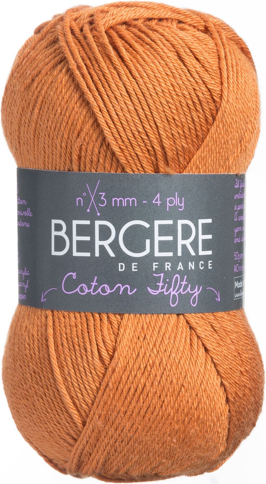 Bergere De France-Coton Fifty Yarn. This fine, but not too fine, round yarn yields an even knit in basic stitches and is easy to care for. Weight category: 2. Content: 50% cotton/50% acrylic. Putup: 1.75ox/50g, 153yd/140m. Gauge: 26sx37r = 4in/10cm on size 3mm knitting needles. Dyelotted: we try but are not always able to match dyelots. Care: machine wash, machine dry, do not bleach, press, dry clean using P solvents. Comes in a variety of colors. Each sold separately. Imported. 1 Pack of 1 Skein