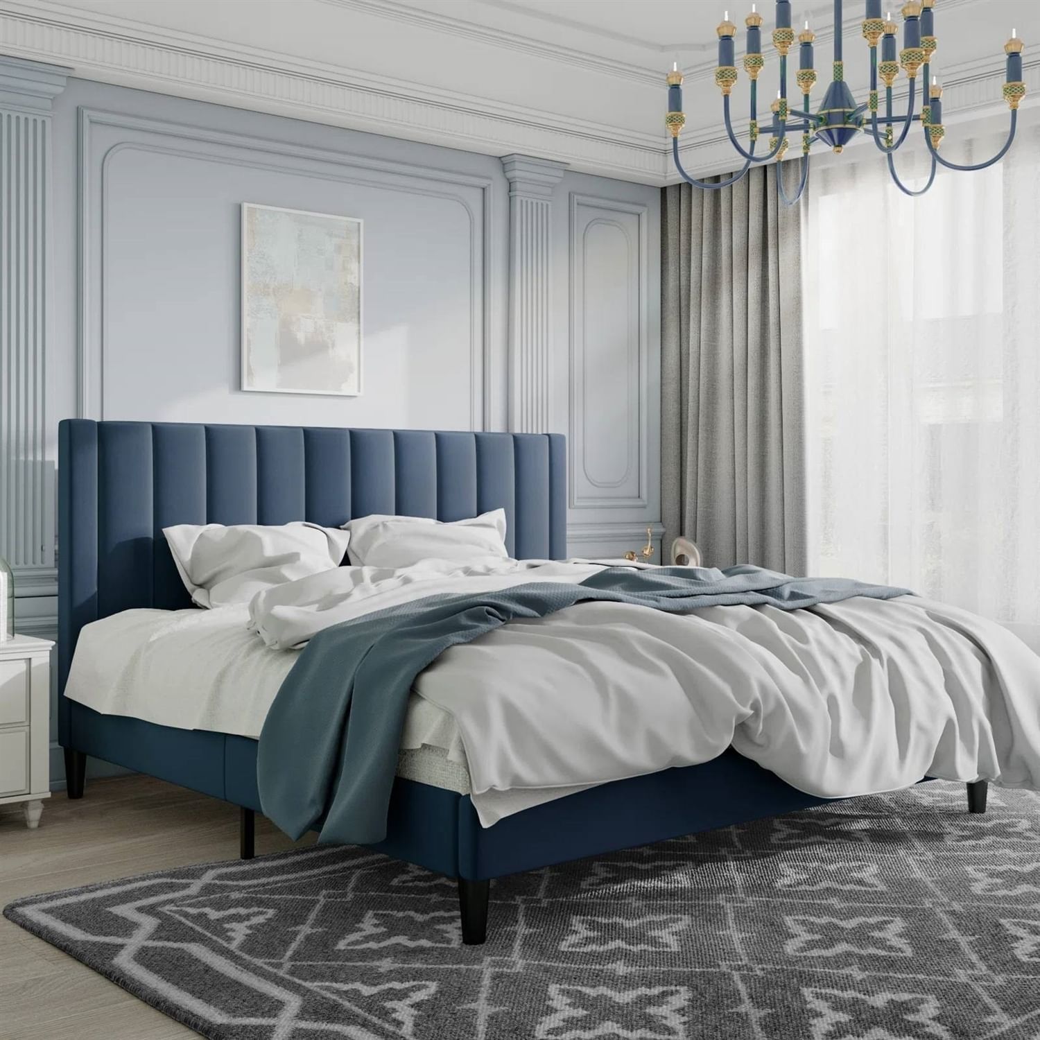 Upholstered in plush velvet, our luxurious bed is the best choice for your classy life. This King size Modern Navy Blue Velvet Upholstered Platform Bed with Headboard also can seriously upgrade your rooms aesthetic. A sturdy steel frame and durable wooden slats offer pretty stability and durability. There are feet on the headboard post and all feet are required to be attached to the frame. Do not use highly corrosive solutions when cleaning the product.
