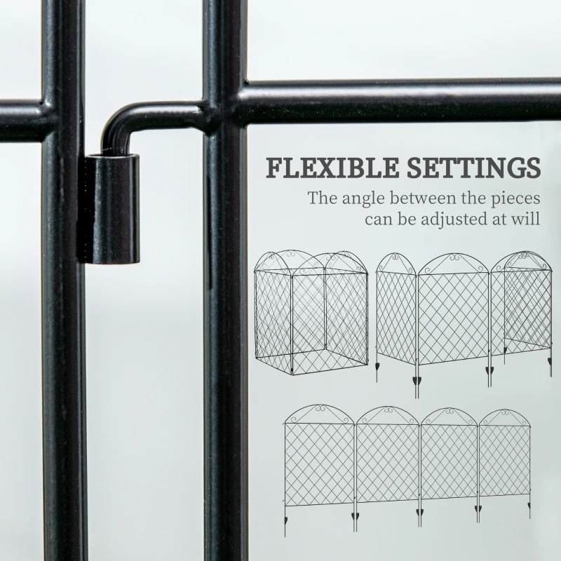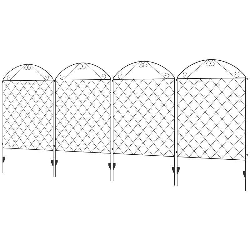 This 4 Pack Steel Foldable Fence Arch Trellis Panel Animal Barrier comes with 4 panels per purchase, measuring 34.75" x 43.25" high. Each set of panels can reach a maximum of 11.5' long. Our metal garden fence customizes into all sorts of angles to suit your needs. Bend the four steel fence panels into shapes like an "I", "L", square, or wave. It's excellent as garden edging for flowers and as a border to another yard. This garden fencing is easy to install with no tools required. The steel panels connect with a simple interlocking design and push straight into the ground with included stakes, making them a portable fencing option.