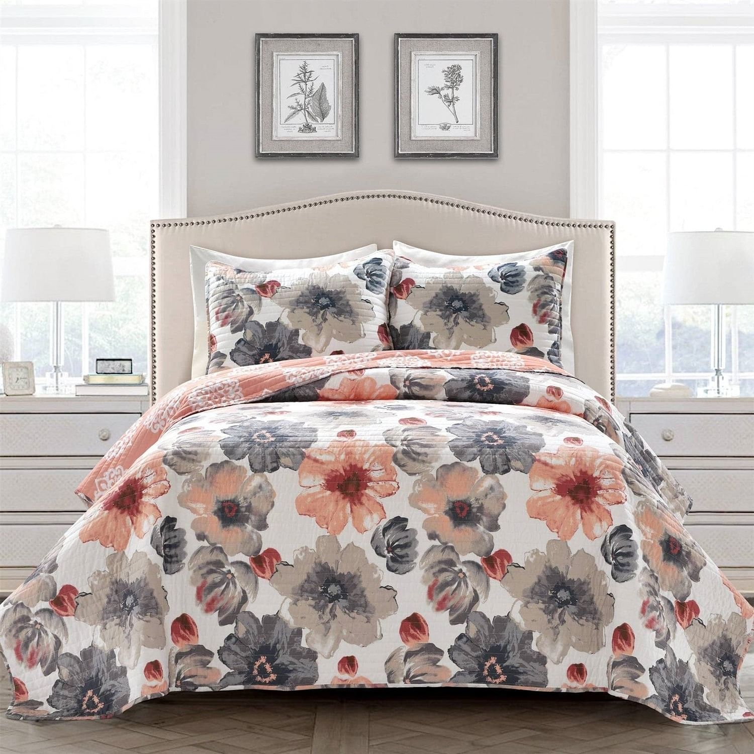 King size Coral Grey Flowers Lightweight Polyester Microfiber Quilt Set