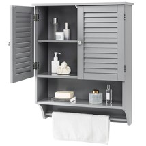 Grey Wall-Mounted Bathroom Medicine Cabinet with Louver Doors and Towel Bar Additional towel bar for hanging your bath towels, ties, belts etc. 3-position adjustable shelf allows you to store different sized items Large storage space: cabinet with inner shelf, open compartment Double louvered doors offer good ventilation to keep items dry Space-saving wall-mounted cabinet fits for limited or small space MDF construction with fasteners for high durability and sturdiness Modern and chic storage cabinet for bathroom, kitchen, living room Waterproof and easy-to-clean surface for easy-peasy maintenance Includes mounting hardware to help easily install it on the wall Color: Grey Material: MDF Package Includes: 1 x Bathroom Wall Cabinet 1 x Instruction Adjustable Shelf Louvered Doors: The inside shelf is designed with 3-level adjustable heights, which allows you to freely adjust it to accommodate items of different sizes. Moreover, the double louvered doors provide better ventilation to keep your inner items dry and clean. Multiple Storage Options: The wall-mounted bathroom cabinet features a large cabinet with 2-tier shelf and an open storage compartment, which can meet your needs for storing various bathroom supplies. And the convenient towel bar offers a perfect perch for your towels. Space-saving Wall Cabinet: This wall-mounted medicine cabinet is a smart way to turn an empty wall in your bathroom, living room or entryway into a practical space, without taking up floor space! (Note: Mounting fittings are provided to easily install the cabinet on the wall.) Quality that You can Trust: Made of durable MDF material and reinforced fasteners with screws, the bathroom cabinet ensures high sturdiness and load capacity. Besides, handy round knobs, quality metal hinges, and strong magnetic catch all allow for easy opening or tight closing. Assembly Cleaning Guide: Illustrated instructions will guide the assembly step by step. And the components are numbered and easy to distinguish. As the cabinet surface is sprayed with waterproof paint, the stains on the surface can be simply wiped off by using a cloth.