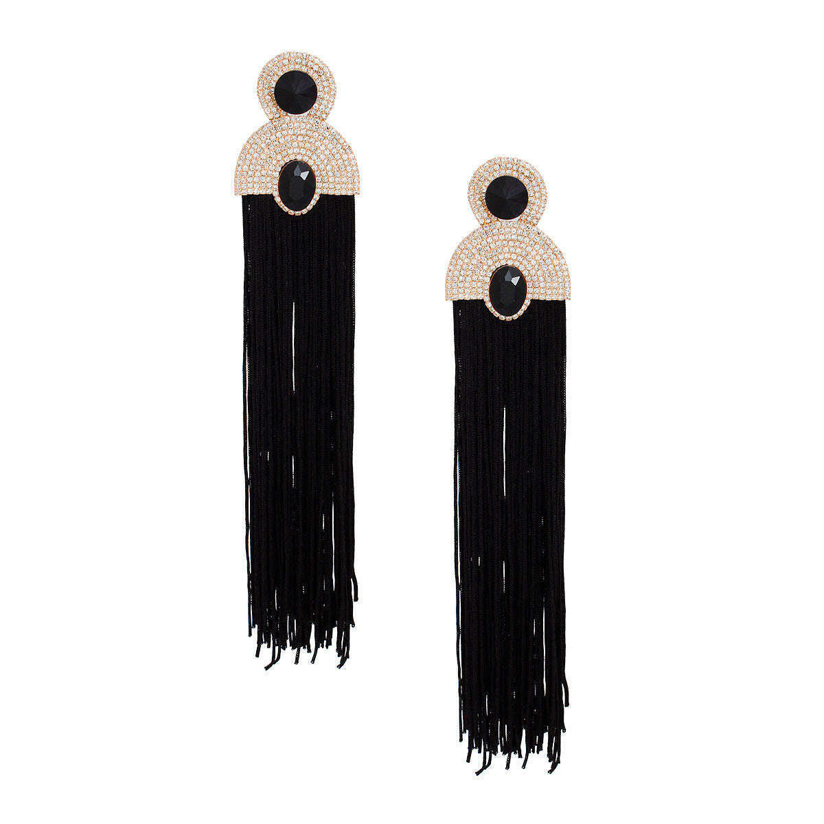The secret lies in their unique blend of timeless design and modern artistry. Each earring boasts a cascade of delicate black tassels, their silky texture catching the light with each turn of your head. The intricate details are crafted with meticulous care, featuring lustrous gold accents and sparkling clear pave rhinestones - these aren't just earrings; they're miniature works of art.