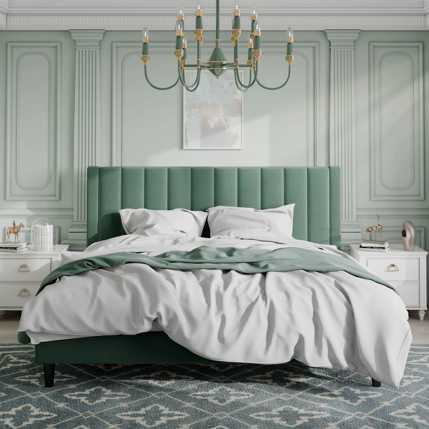 Upholstered in plush velvet, our King size Green Velvet Upholstered Platform Bed Frame with Headboard is the best choice for your classy life. This bed frame also can seriously upgrade your rooms aesthetic. A sturdy steel frame and durable wooden slats offer pretty stability and durability. There are feet on the headboard post and all feet must be attached to the frame. Do not use highly corrosive solutions when cleaning the product.