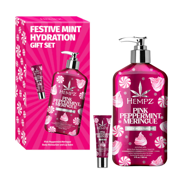 Hempz Festive Mint Hydration Set- Pink Peppermint Meringue Moisturizer &Lip Balm