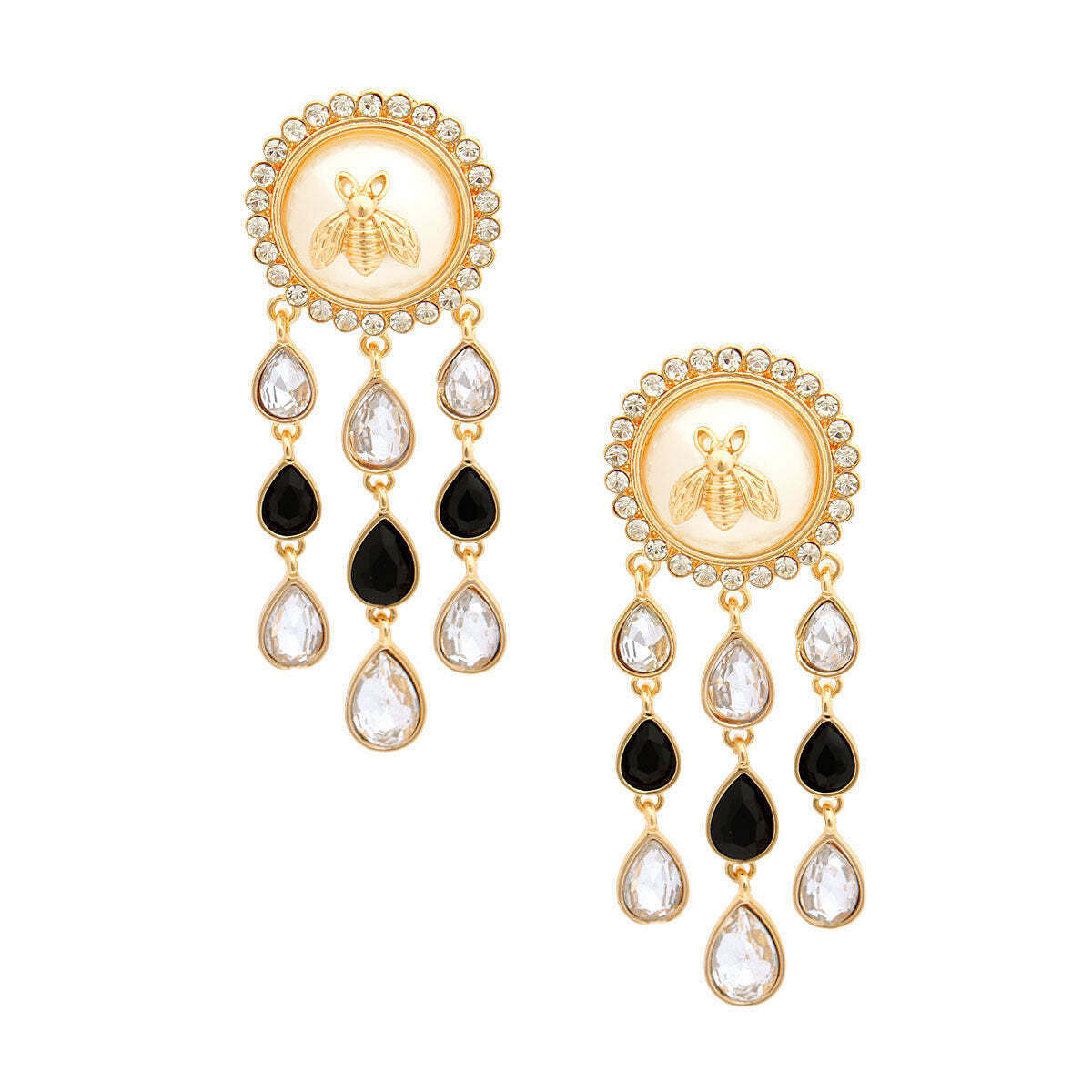 Vintage Inspired Gold Metal and Cream Pearl Bee Stud Earrings Featuring Clear Rhinestone Detailing Plus Clear and Black Teardrop Crystal Fringe. Earrings measure 1.25 inches wide.