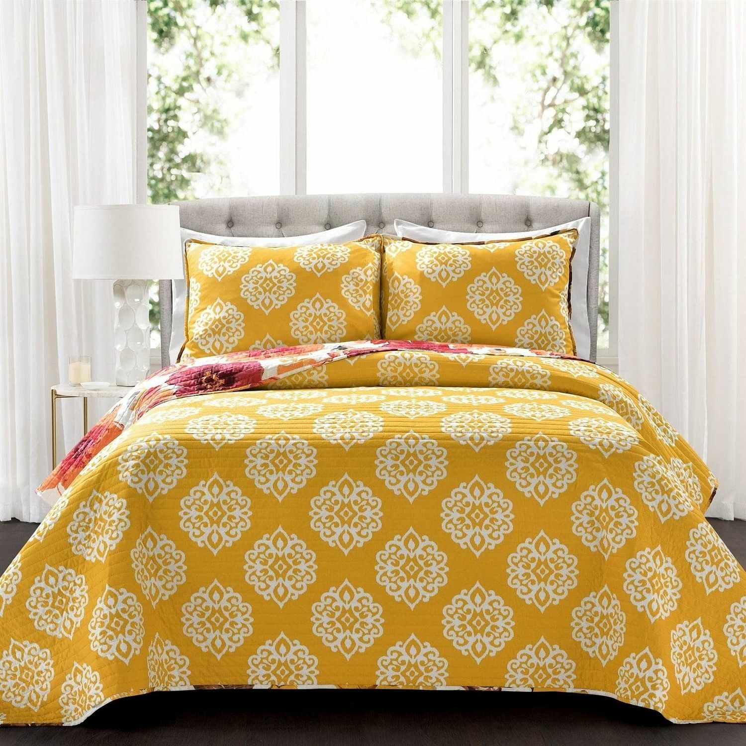 3-Piece Set Includes: 1 Quilt, 2 Shams Thin/Light - Perfect for Spring/Summer on those warmer nights Fabric Content: 100% Polyester Fill Content: 100% Polyester 150 GSM Reversible Floral Printed Care Instructions - Use Front-Load Commercial Grade Washer And Dryer. Dimensions: Quilt: 92"H x 88"W; Shams: 20"H x 26"W Weight 5 lbs.