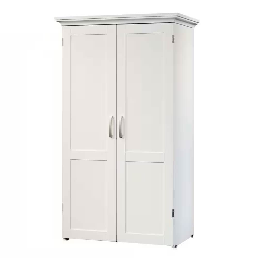 If collecting craft supplies has become as much of a hobby as crafting itself, this Drop Leaf Computer Desk Craft Table Armoire in White Wood Finish - Made in USA should be your next investment. This computer armoire easily conceals an extra workspace until youre ready, with a drop leaf work table that fully extends, revealing an entire work surface. Its the perfect spot for drawing, painting, working from a laptop, or placing a sewing machine. The center shelf of this armoire with fold-out desk also features a power strip with six outlets for convenient electrical access without the chaos of cord clutter. Six adjustable shelves provide convenient and flexible space for storage of files, folders, stencils or reams of paper. The lower slide-out shelf of this craft armoire offers retractable storage space for a printer or a cricut machine, providing easy access or a hiding space. Finished in White Wood Finish, this space-saving cabinet can function as a craft or sewing armoire, an office armoire, or all three!