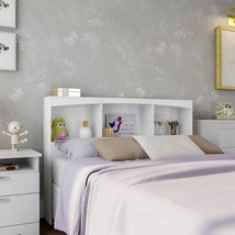 Full size Modern Farmhouse Bookcase Headboard in White Wood Finish Sleek and simple style: this modern bookcase headboard blends minimalist style and functionality in a simple and elegant piece of bedroom furniture Accessible bedside storage: this headboard provides 3 open storage spaces and a top shelf within easy reach A clean approach: consolidate all your wires and cords to feed through one hole in the back panel Requires complete assembly by 2 adults (tools not included) Packaging tested and certified to reduce the risk of damage during shipment Accessories not included Product's packaging has been tested and is certified to reduce the risk of damage during shipment Made in Canada with non-toxic laminated particleboard Assembly Required: Assembly Required Color Family: White Color/Finish: Pure White Finish Family: Other Furniture Features: No Additional Features Headboard Mount Type: Bed Frame Mounted Headboard Type: Panel Headboard Interior Furniture Type: Headboard Material: Particle Board Size: Full Style: Industrial, Modern Total Weight Capacity: 30 lb Upholstery Material: Non-upholstered