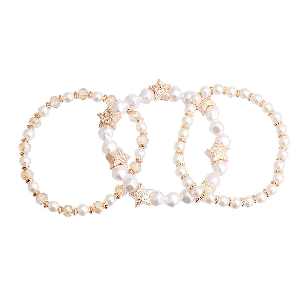 Shine Bright: A Gift That Keeps Giving: These aren't just any stretch bracelets; they're a little bit of luxury in every fold, every curve. The warm glow of the gold star charm contrasts beautifully with the delicate cream pearl beads. This three-piece set is designed to be your everyday companion, from work meetings to late-night walks.