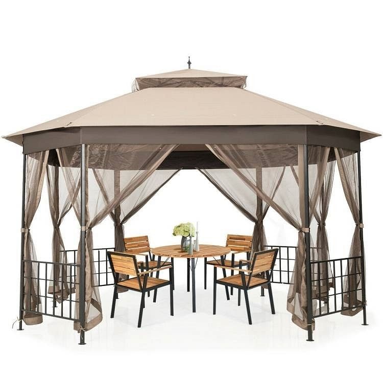 Outdoor 10 x 12 Ft Octagon Gazebo with Mosquito Net Sidewalls and Brown Canopy