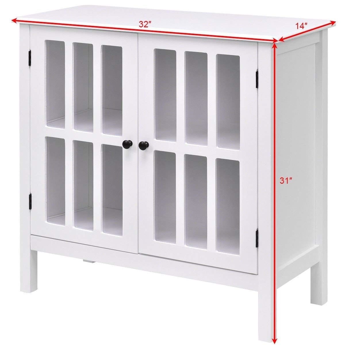 White Wood Bathroom Storage Floor Cabinet with Glass Doors Solid MDF Construction Durable And Sturdy 2 Tempered Glass Doors Make Full Use Of Space Fit Into Any Rooms Offer Plenty Of Space For All Of Your Things Fits In With Almost Any Home Decor Assemble Required Color: White Material: Pine+ MDF board+ tempered glass Package include: 1 cabinet Sturdy Body Solid Shoulder Sturdy construction made of MDF material features solid and stable while shouldering your various kinds of daily essentials It is surely your reliable helper in refreshing your home to a neat and organized place, which can bring you a long lasting using satisfaction Multiple Values Premium Performance With 2-tier shelf and 2 tempered glass doors design, you can surprisingly place your any items in or on it as you like Transparent glass-paneled doors makes it easy for you to identify your goods With handle for easy opening and closing Optimal Organizer Space Saver It maximizes your room's available space while providing functional storage, which also makes you quick access to your room accessories It is ideal as a bedside table, in the bathroom, hallway, living room etc for your storage needs Easy Assembly Quick Storage Easy to assemble with the included hardware can also wipe out the installing troubles Quick disassembly enables you to store this portable shelf and can easily find its position when you move in or move out Simplistic Style Concise Appearance Simplistic style with white brings you a brand new feeling of style Its pure-white finish, all together gives you a classic look, modern and elegant style. Overall Dimension: 32"14"31" (LWH) Distance between each shelf: 13.8" Net Weight: 38 Lbs