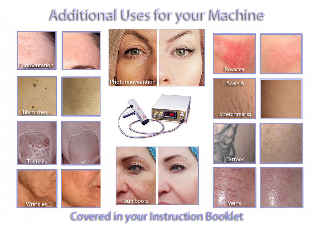 Approved For: Spider - Varicose Vein Reduction, Permanent Hair Reduction, Skin Toning, Body Sculpting, Photo Rejuvenation, Hyper Pigment - Age Spot Removal, Tattoo Removal, Wrinkle Reduction, Scar - Stretch Mark Reduction, Psoriasis, Rosacea, Sun Damage, Blemish (mole, wart, skin tag) Removal, Nail Fungus Treatment, and More. These treatment options are covered in the literature sent with the system.