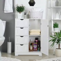Modern Farmhouse 4-Drawer Bathroom Linen Cabinet in White Wood Finish High-quality material: the bathroom cabinet is made of P2 MDF with a non-toxic water-resistant painting, the smooth appearance of the bathroom floor cabinet with its elegant finish can perfectly fit any bathroom, or laundry room and add a touch of brightness Adjustable and removable shelves: the shelf of the bathroom storage cabinet is 3-level adjustable and removable to meet the size of different items, it allows customized storage to suit practical needs Dimension: the overall dimension of the bathroom linen cabinet is 23.6 in. W x 11.8 in. D x 31.6 in. H. the size of the drawer is 9.2 in. W x 9.2 in. D x 4.3 in. H. 4 drawers and 1 cupboard: This bathroom towel storage has 4 drawers with a safety-stop mechanism and a closed cabinet. The spacious storage space can store bathroom supplies like toiletries, towels, and toilet paper. It is a good helper for your bathroom organization and storage. Anti-toppling design: The storage organizer cabinet with 4 drawers and 1 cupboard is equipped with an anti-toppling device. It can be firmly fixed to the wall and you can rest assured that the use of such a safe bathroom cabinet at home. At the same time, the stability of the bathroom floor cabinet is also undoubted, bringing you the most comfortable experience. Weight Capacity: Each drawer can hold up to 45 lbs, and the shelf in the cabinet can hold up to 50 lbs. Assembly Required: Ready to Assemble Color Family: White Color/Finish: White Features: Adjustable Shelves, Drawers Included: Linen Cabinet Material: MDF Mount Type: Freestanding Number of Doors: 1 Door Number of Drawers: 4 Drawers Number of Shelves: 1 Adjustable Shelf