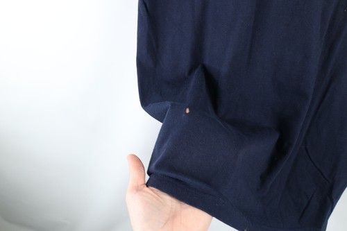 Blemishes and discoloring on the front. Has color fade. Cut on the back bottom. Blemish on the back. USA made
