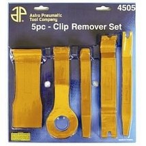 Set includes 5 distinctive tools for easy removal of fastener, molding, wheel hubs, etc. For use on internal and external vehicle molding and trim fasteners Plastic construction of tools prevents scratching and damage to vehicle paint, leather, chrome, etc. 5-piece set Astro Pneumatic