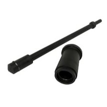 Pneumatic bushing driver set removes and installs truck and trailer 1-3/8" anchor pin bushings and stuck anchor pins. Includes an 11-1/2" long driver that allows bushings to be driven straight without removing the hub assembly. Double-sided cone snaps onto driver to drive out and install bushings. Use flanged end to install and tapered end to remove. Also removes truck leaf spring bushings.