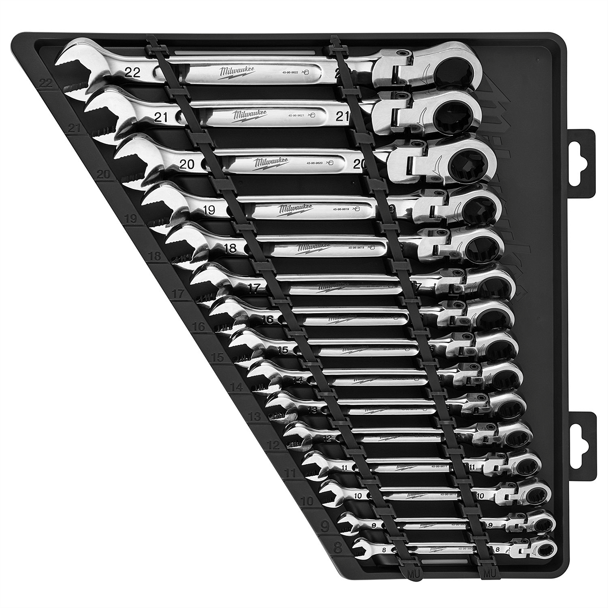 The MILWAUKEE 15 Piece Metric Flex Head Ratcheting Combination Wrench Set features 2.5 degrees of arc swing and 144 ratcheting positions, allowing quick and efficient work in tight spaces. The flex head wrenches have double-stacked pawls within the ratcheting mechanism, which increases durability and extends the life of the tools. The flexible head allows for increased accessibility in areas that are difficult to reach. The MAXBITE? Open-End Grip improves the wrench's grip on nuts and bolts, offering 25% more torque than smooth-faced wrenches. This flex head wrench set feature ergonomic I-Beam handles designed for improved comfort and ink-filled size labels for easy size identification and quick distinction between SAE and metric sets. The 15-piece ratcheting combination wrench set comes in a tray designed for steel storage drawers for efficient storage with no wasted space. Milwaukee combination wrenches feature a lifetime guarantee.