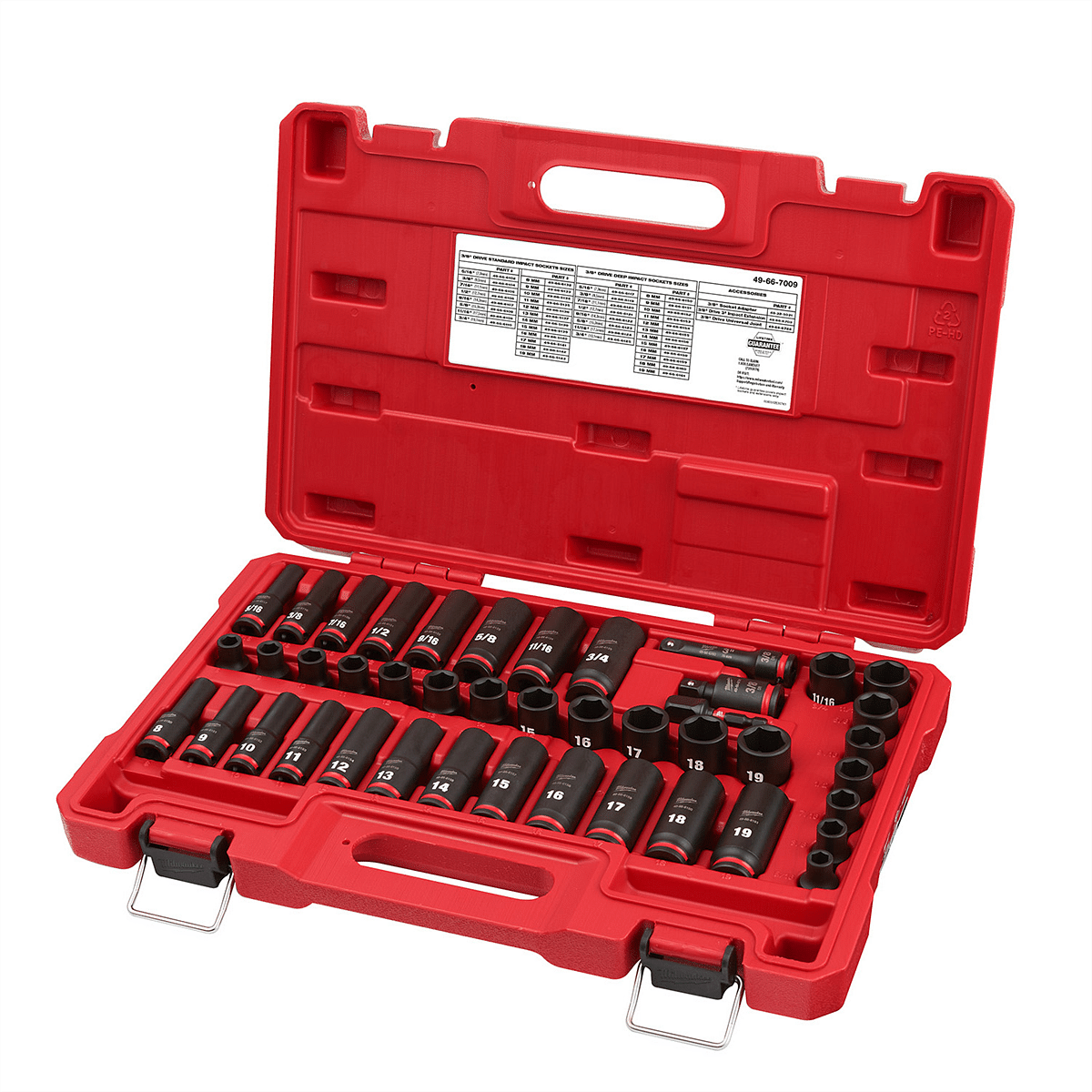 Stamped and ink filled diameter markings for wear resistance 6-Point design made with forged impact steel for durability in high torque applications backed by our Lifetime Guarantee Dual hole design and groove for easier attachment Non-slip hex geometry to prevent socket and fastener rounding Lifetime Guarantee covers impact sockets and extensions only Laser etched part number Optimized for use with 3/8" drive impact wrenches, drivers, ratchets, and adapters Kit includes 40 Standard and Deep Metric and SAE Sockets and 3 Accessories. The following sizes are included in Standard and Deep: 5/16, 3/8, 7/16, 1/2, 9/16, 5/8, 11/16, 3/4, 8, 9, 10, 11, 12, 13, 14, 15, 16, 17, 18, 19, and (1) 3" Extension, (1) Universal Joint, and (1) 3/8" Adapter Impact resistant case with nestability for easy stacking and storage