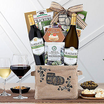 This new gift tote is a great gift for those who enjoy red or white wine. Blakemore crisp chardonnay with apple, pear and citrus notes, and cabernet with smooth dark fruit flavors arrive with Vine e Formaggio smoked Gouda cheese spread, olives, vanilla fudge with sea salt, spicy honey crunch snack mix and more.