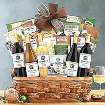 Five wines from Hobson Estate and an abundance of gourmet food overflow from this impressive gift basket. Cabernet, chardonnay, pinot noir, merlot and pinot grigio are paired with enough food to please the whole crowd. Limoncelli cookies, Lindt and Godiva milk chocolate truffles, sesame crackers, smoked Gouda cheese spread, lemon cakes, chocolate brownies, vanilla fudge with sea salt, olives, organic dried figs, tiramisu truffles, fruit jelly candy and more are included so everyone can find a wine and food pairing to enjoy.