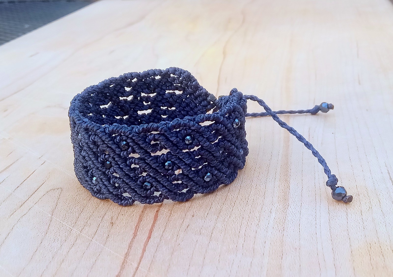 Beautiful macrame bracelet made with navy blue thread and steel blue crystal beads. It is 1 inch wide and it adjusts to your wrist (6 inches - 10 inches).
