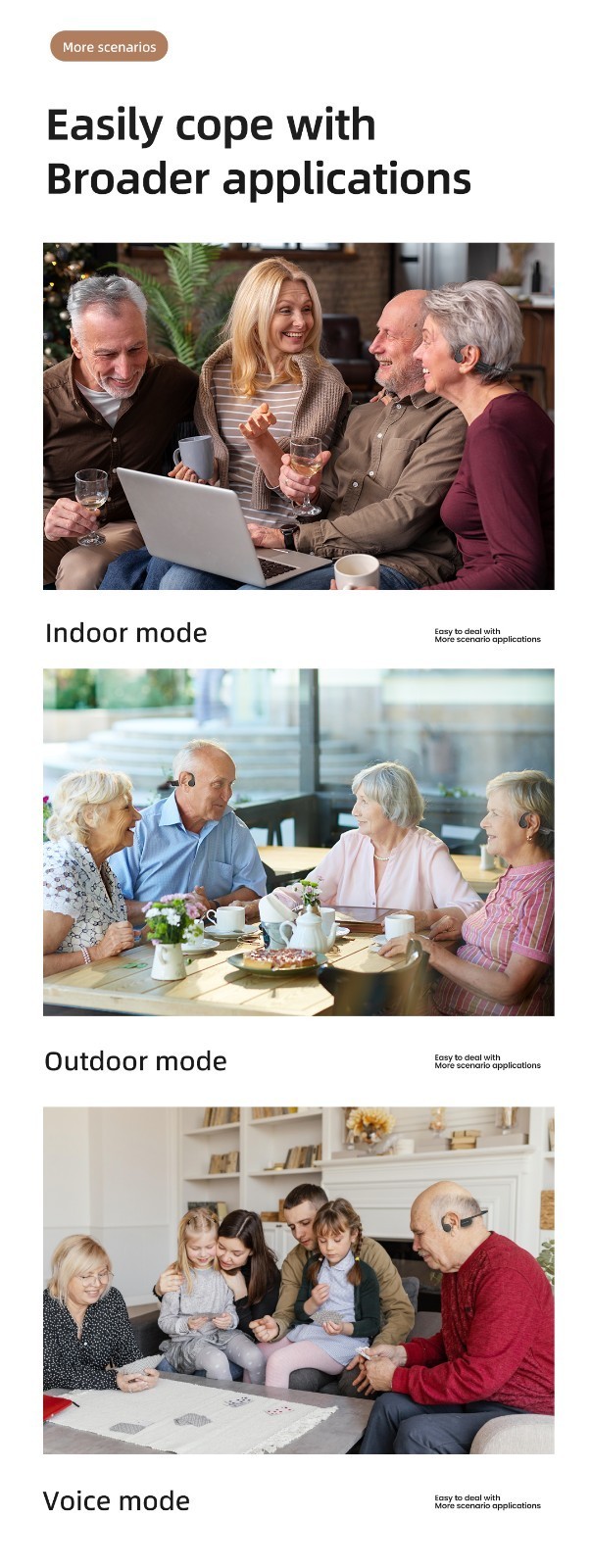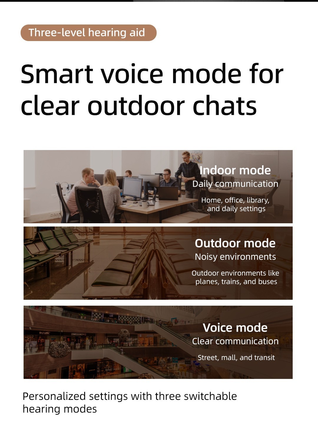 Voice Mode: Prioritizes speech for clear communication on the street, in malls or transit.