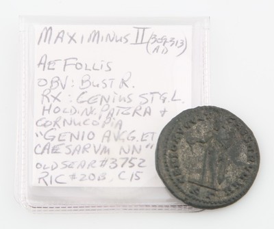 309-313 AD Romain Argente Piece AE Follis XF Maximinus II Daia Genius S # 3752