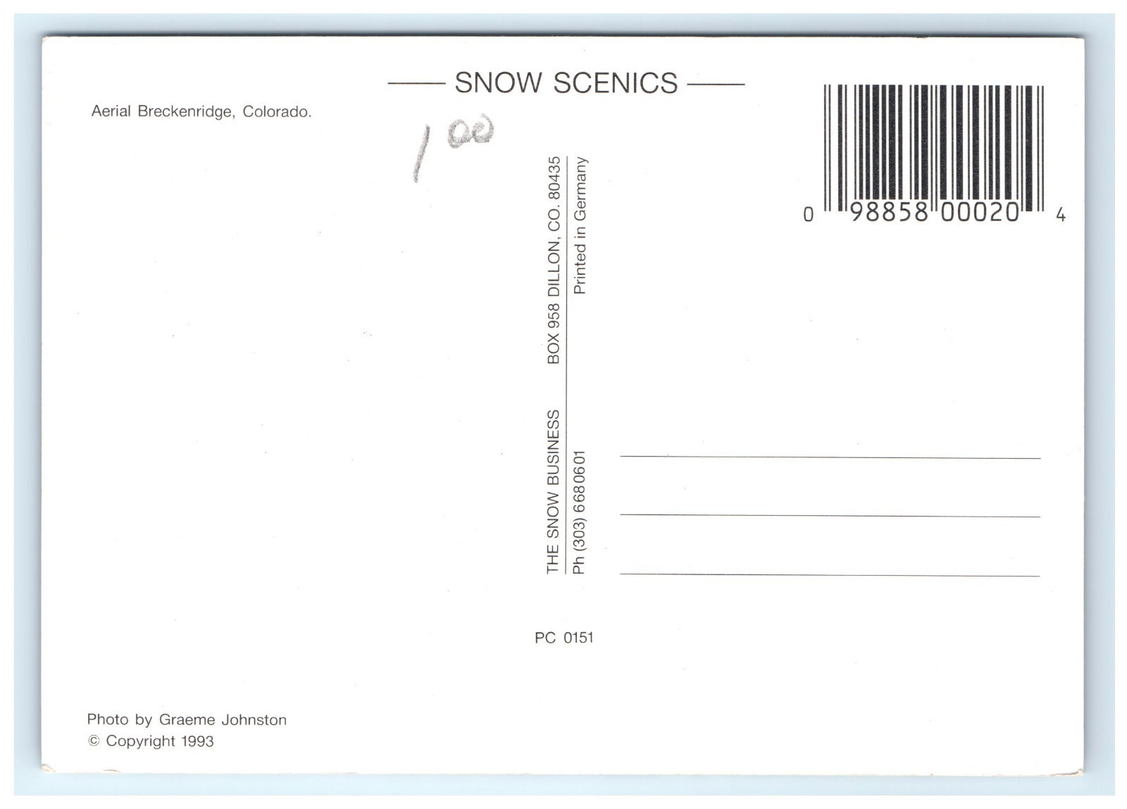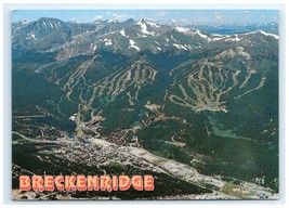 This postcard shows an aerial view of Breckenridge ski resort with mountain slopes, runs, and the town surrounded by the Rocky Mountains in Colorado.