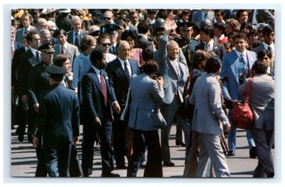 Published by Coral-Lee of Rancho Cordova, California, and featuring a color photo by Alon Reininger, this chrome postcard is an original collectible from 1980. The back provides a detailed caption explaining the significance of the visit and the political context. Produced by Mike Roberts Color Productions of Emeryville, CA, this postcard is a valuable piece for collectors interested in presidential history, international diplomacy, or vintage political memorabilia.