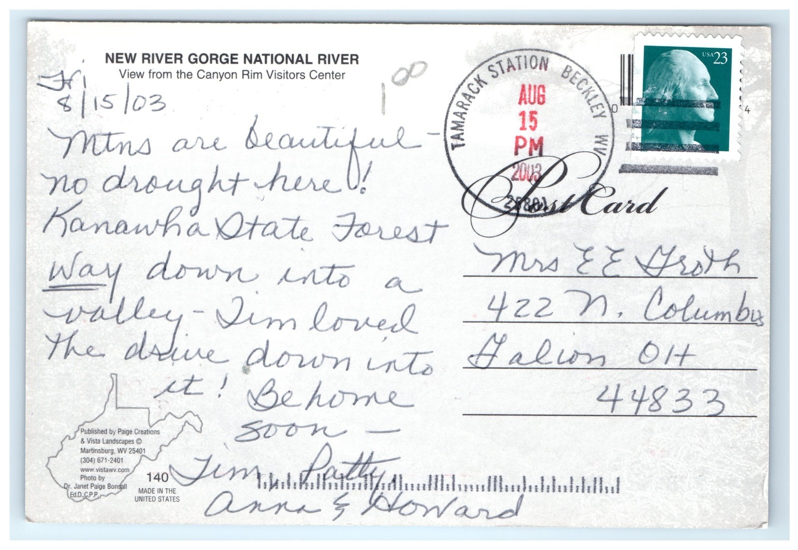 Published by Paige Creations Vista Landscapes in Martinsburg, WV, the postcard includes a photo credit to Dr. Janet Paige Bonsall, Ed.D., C.P.P. Dated August 15, 2003, and postmarked from Tamarack Station in Beckley, WV, this collectible piece offers a glimpse into the early 2000s era of West Virginia tourism. Ideal for collectors of regional postcards, nature-themed memorabilia, or those with an interest in American national river landmarks.