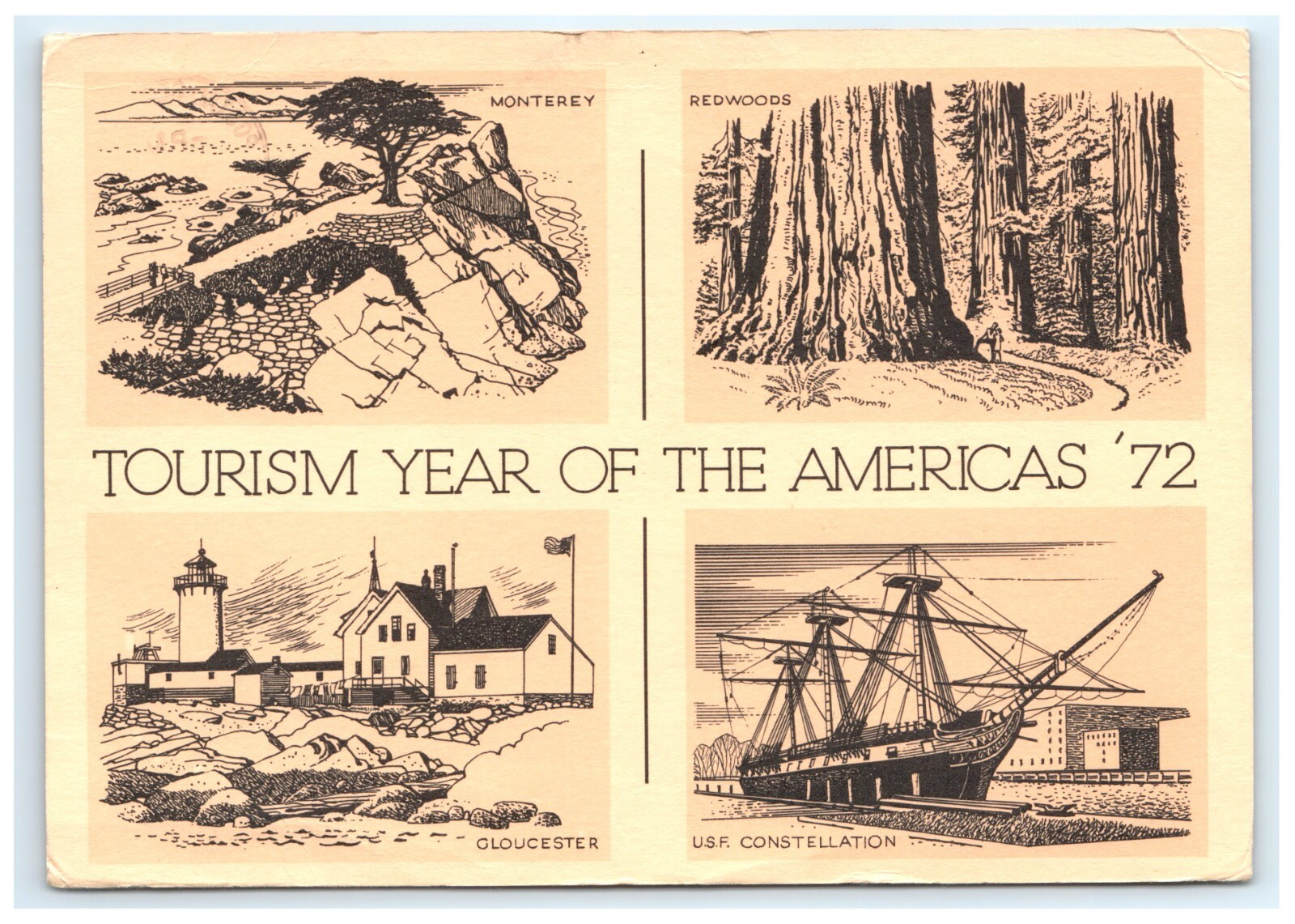 Vintage Divided Back Postcard Depicting Drawings of Touris Year of the Americas "72 Including Monterey Redwoods Gloucester and U.S.F. Constellation