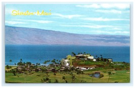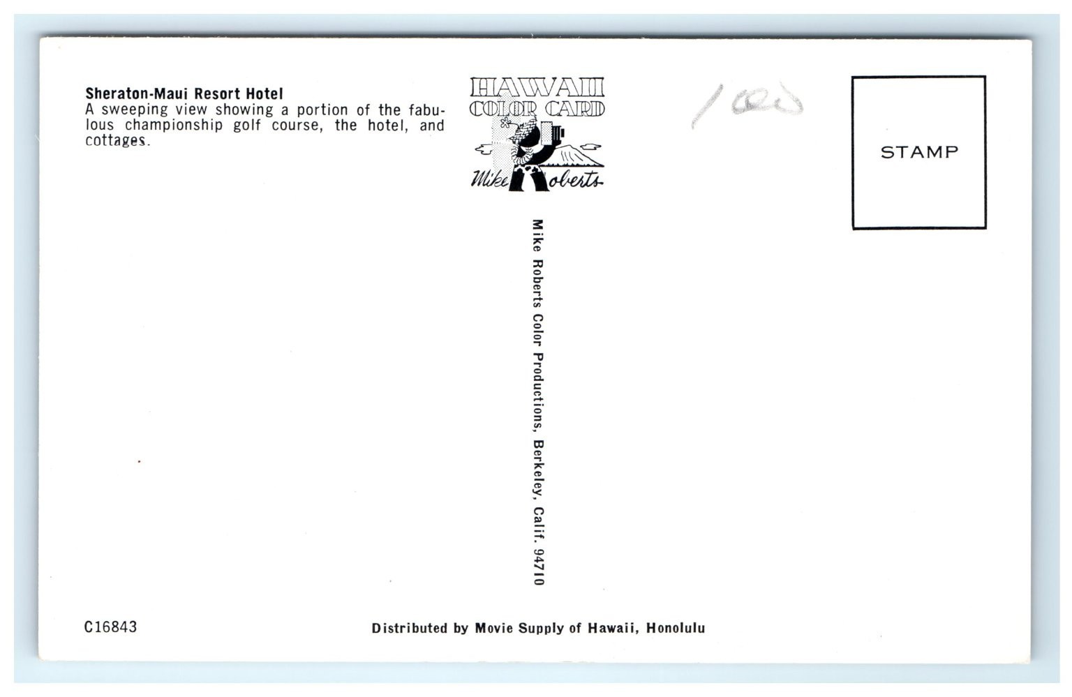 This vintage chrome postcard features a sweeping lithograph view of the Sheraton Maui Resort Hotel, showcasing its lush championship golf course, hotel, and cottages set against the stunning backdrop of the Pacific Ocean and island mountains. The postcard vividly captures the tropical beauty and serene landscape of Maui, Hawaii, with vibrant colors and fine detail typical of mid-20th century chrome postcards.