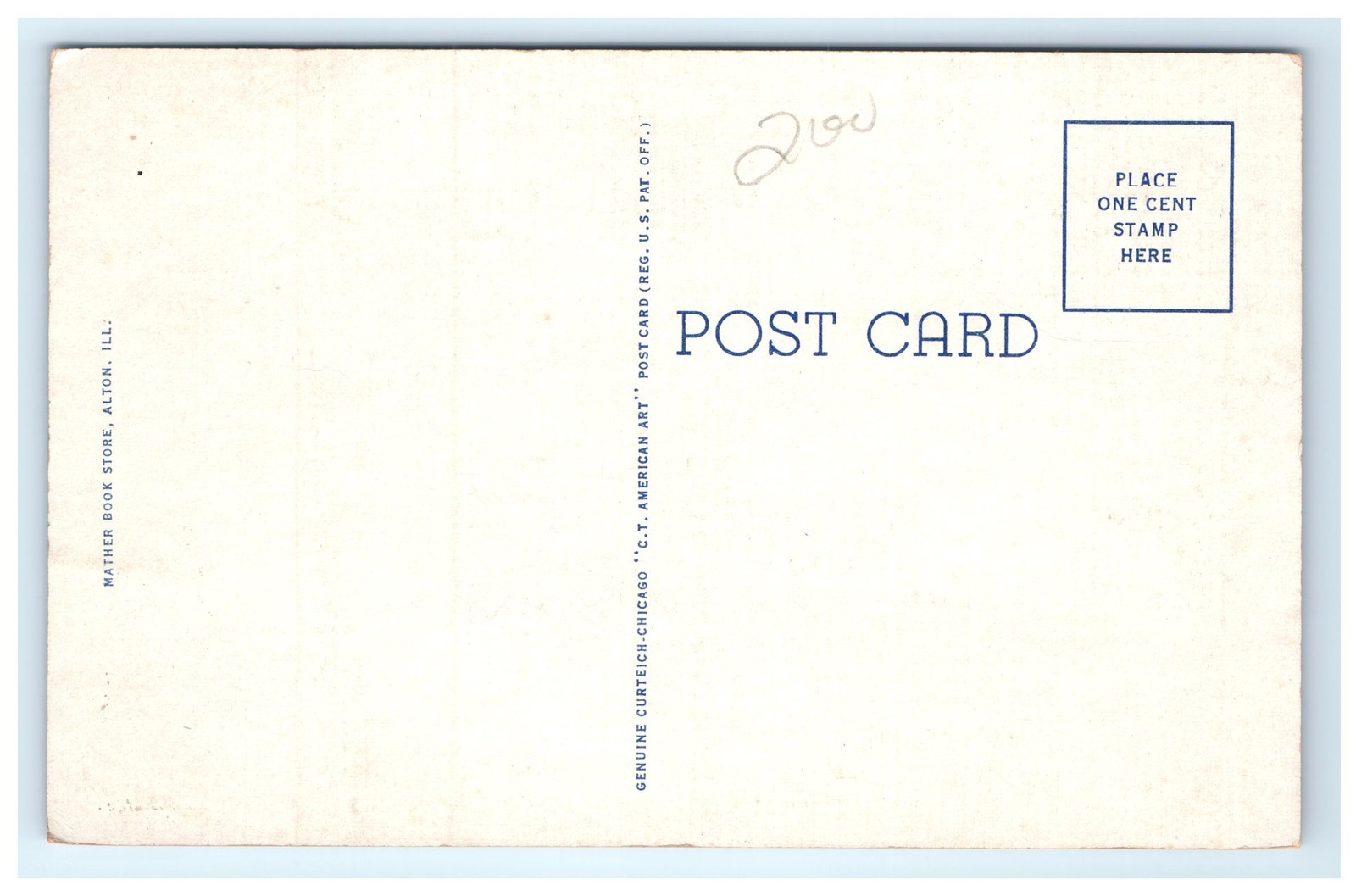 The back of the postcard includes a clear indication that it was sold at the Mather Book Store in Alton, Illinois, adding a layer of local collectible appeal. This unused, unposted postcard with a chrome finish is a delightful example of mid-20th century American printed ephemera. Its standard size (approximately 5.5 x 3.5 inches) fits neatly into most postcard collections, especially those focused on Midwestern US locations or vintage linen postcards. A great addition for collectors of American regional memorabilia or vintage postcards.