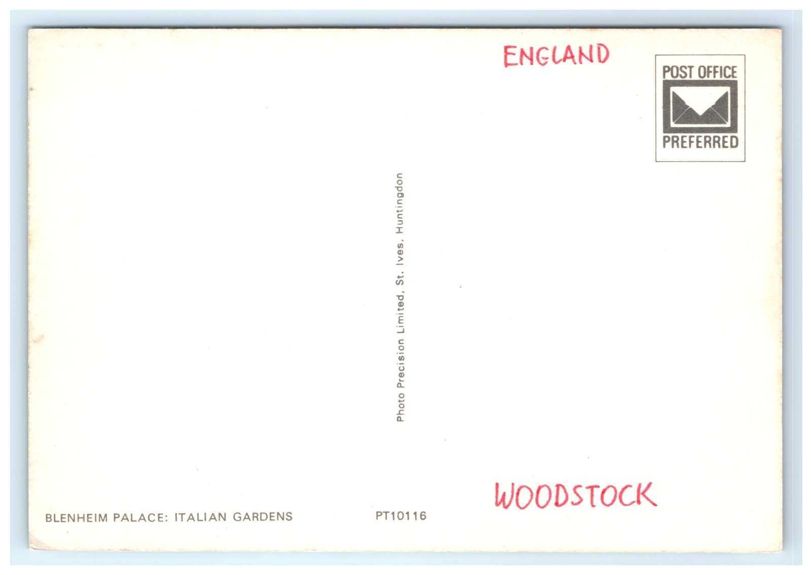 This postcard captures the elegant Italian Gardens of Blenheim Palace in Woodstock, England. Featuring manicured hedges, ornate statues, fountains, and grand palace architecture, it showcases the formal beauty and historic atmosphere of this UNESCO World Heritage Site.