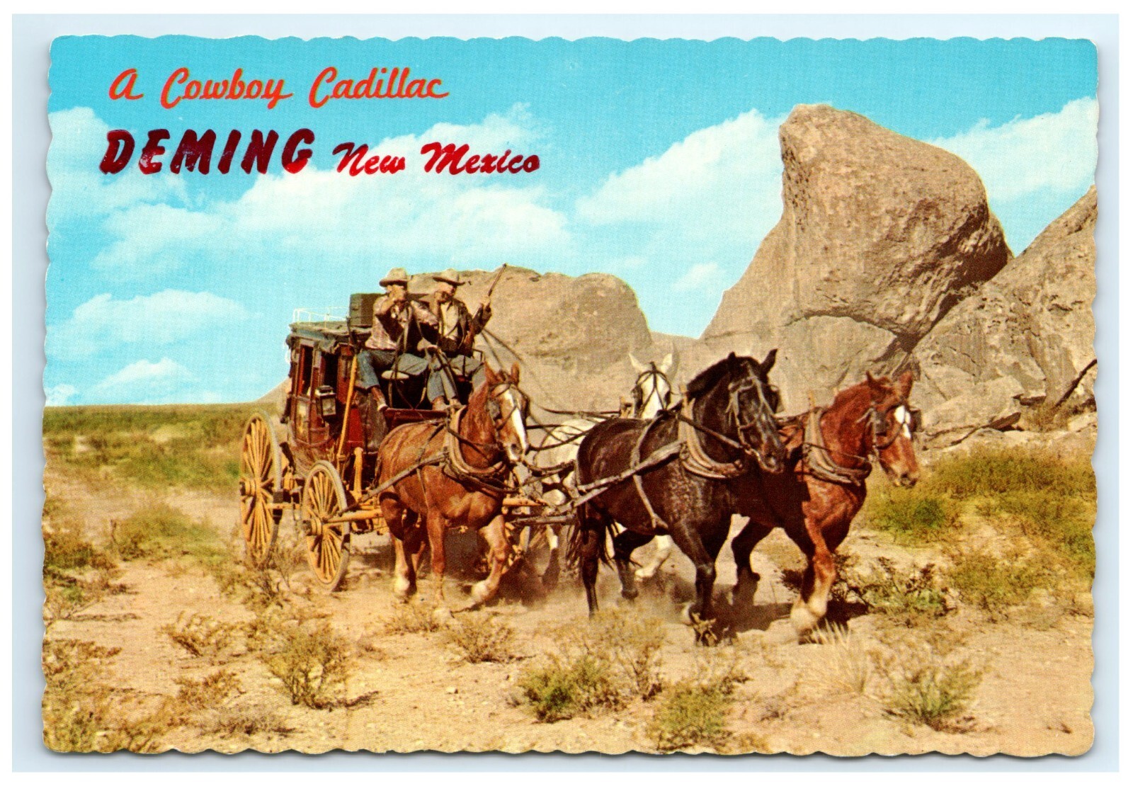 Vintage Divided Back Postcard Depicting a Cowboy Cadillac Stage Coach Horse and Carriage Located in Deming New Mexico.