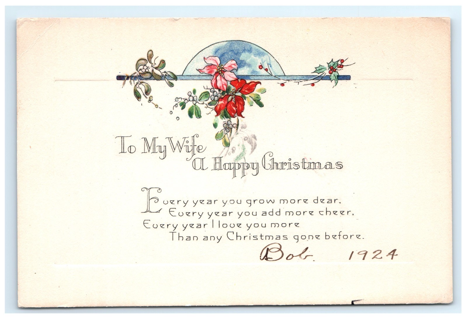 This vintage 1924 postcard features a romantic Christmas greeting titled ?To My Wife A Happy Christmas.? The design includes poinsettias and holly with a poetic verse about love and devotion during the holiday season. Signed ?Bob, 1924,? this card reflects the personal charm of early 20th century holiday correspondence.