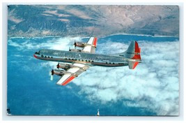 This vintage postcard features a striking lithograph image of the American Airlines Electra, a pioneering jet-prop airliner, soaring above a scenic coastline with mountains in the background. The aircraft's polished chrome body with red accents on the tail and wings beautifully captures the sleek, modern design of the early jet age. The view highlights American Airlines' status as the first airline to operate jets across the U.S.A., emphasizing the innovation and speed of the Electra model.