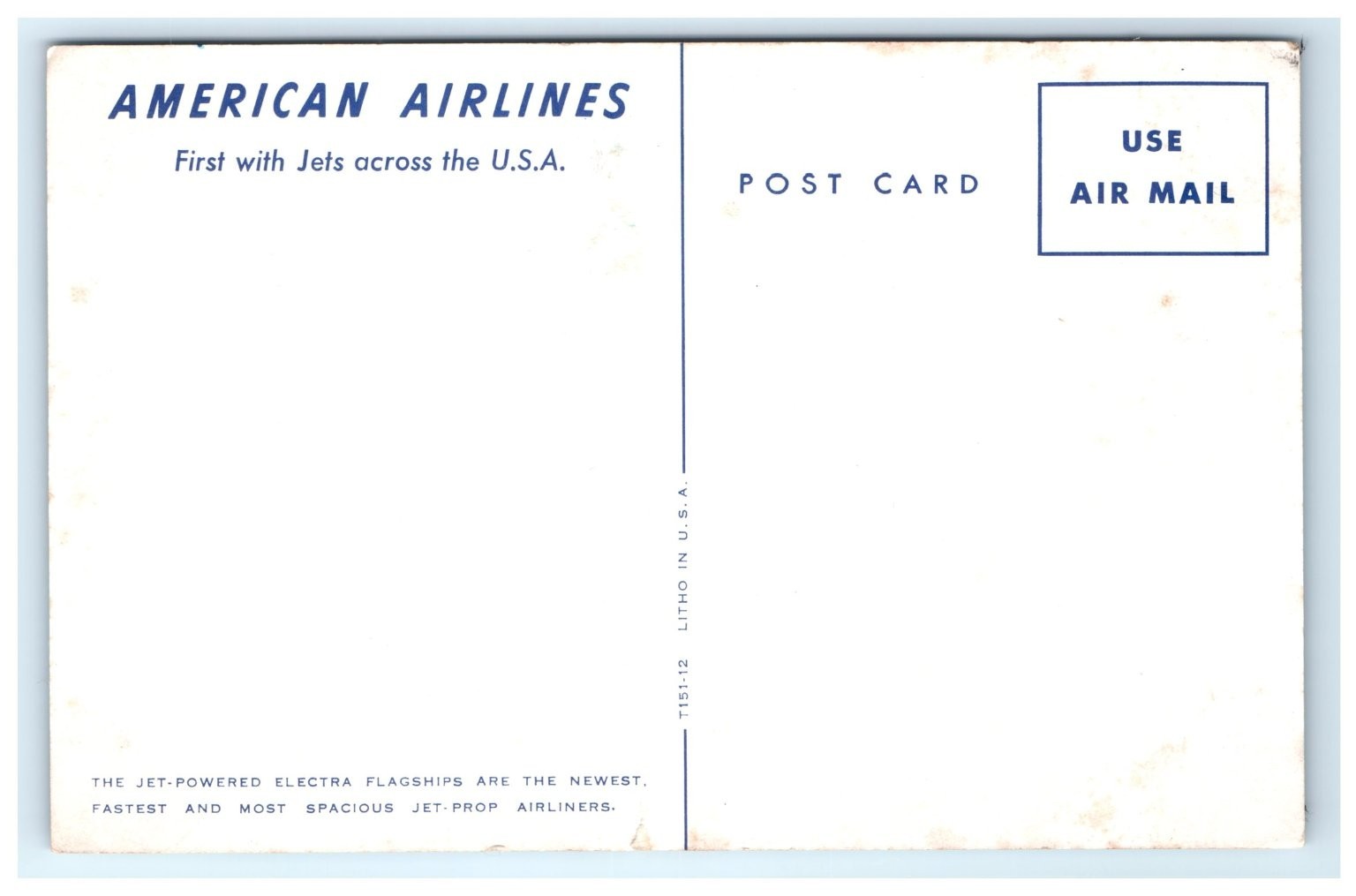 Produced as a chrome postcard, this piece showcases vibrant colors and fine lithographic printing techniques typical of mid-20th century aviation memorabilia. The back of the postcard is marked with classic American Airlines branding and a promotional tagline touting the Electra's spaciousness and advanced technology. A rare collectible for aviation enthusiasts and postcard collectors alike, this unposted item preserves a fascinating moment in airline history and mid-century travel culture.