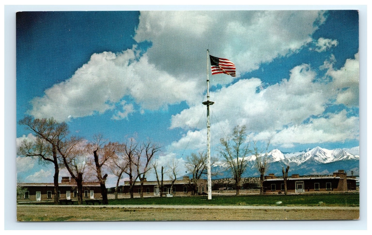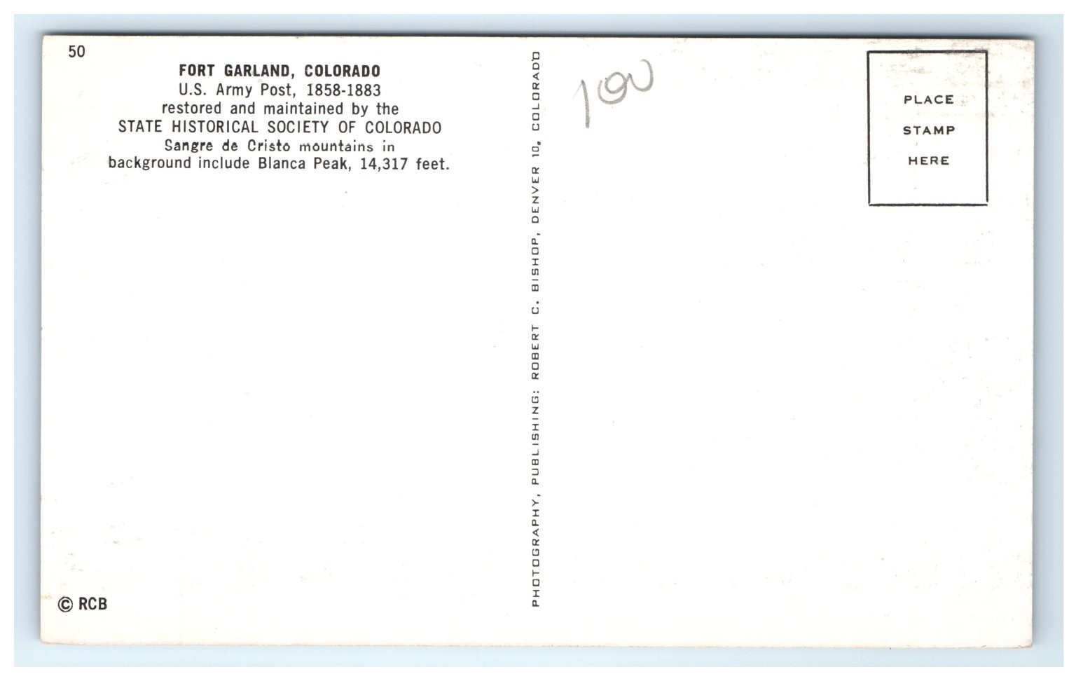 This vintage chrome postcard features a striking view of Fort Garland, Colorado, a historic U.S. Army Post active from 1858 to 1883. The image beautifully captures the fort's buildings set against the majestic backdrop of the Sangre de Cristo mountain range, including the prominent Blanca Peak at 14,317 feet. The clear blue sky with scattered clouds and the American flag flying high on the flagpole add a patriotic touch to this scenic depiction.