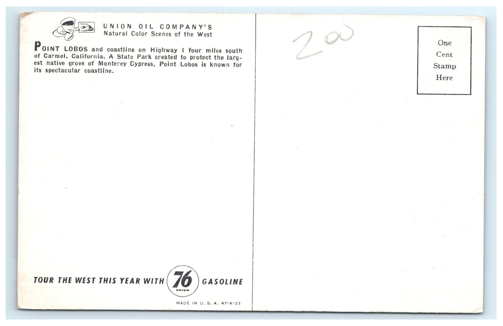 Published by Union Oil Company as part of their "Natural Color Scenes of the West" series, this postcard invites collectors and travelers to "Tour the West This Year With 76 Gasoline." The back of the card includes descriptive text about the location, a designated one-cent stamp box, and the printed code 47-A-23, indicating a mid-20th century era likely around the 1940s to 1950s. The postcard is a classic example of chrome lithography, prized by collectors for its vivid color and glossy finish. It is a desirable collectible for enthusiasts of California landmarks, vintage travel memorabilia, and historical postcards.