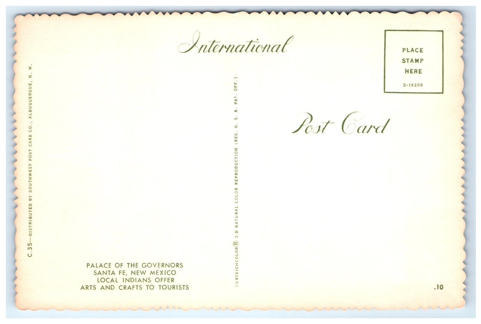 Vintage Divided Back Postcard Depicting the Palace of Governors Where Local Arts and Crafts are Offered to Tourists Located in Santa Fe New Mexico.